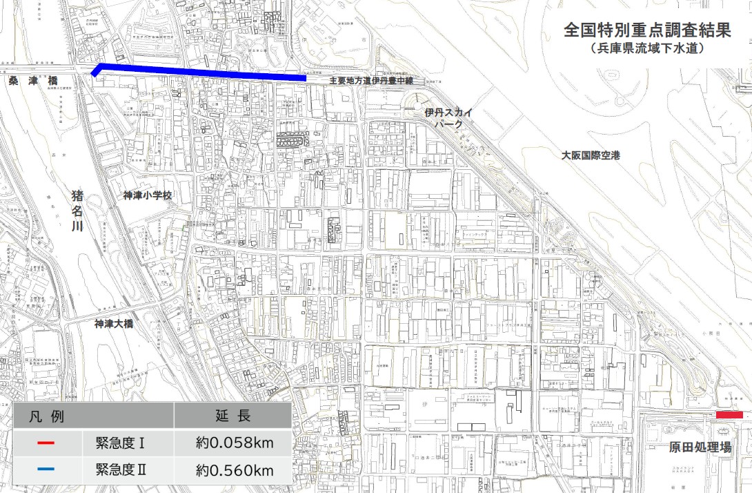 兵庫県が管理する流域下水道においては、令和7年夏までに調査を完了し同年9月17日に公表された優先実施箇所と、今回発表のあった優先実施箇所以外を合わせて、対策が必要な延長は18km(緊急度1の延長は1km、緊急度2の延長は17km)でした。