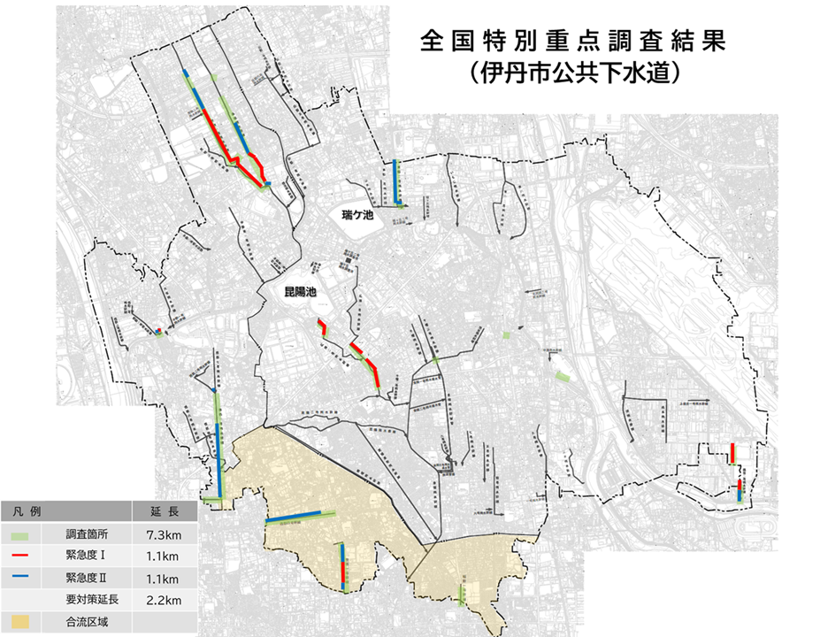 伊丹市が管理する公共下水道においては、本調査の対象として、優先実施箇所以外が約7.3kmあり、目視による調査を実施した結果、対策が必要な延長は2.2km(緊急度1の延長は1.1km、緊急度2の延長は1.1km)でした。