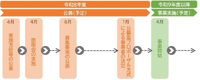 本市では、令和9年度の事業開始に向けて実施方針等の公表を予定しております。現時点でのスケジュール(予定)は、下記のとおりとなります。
